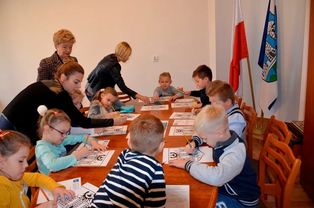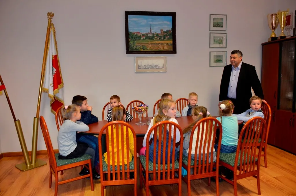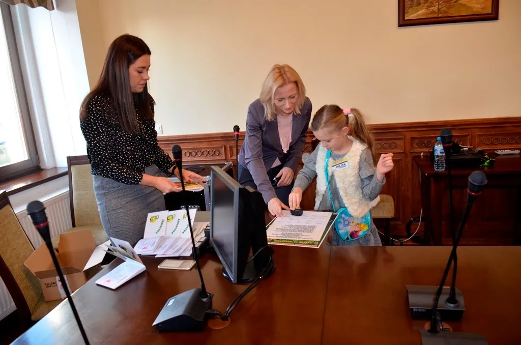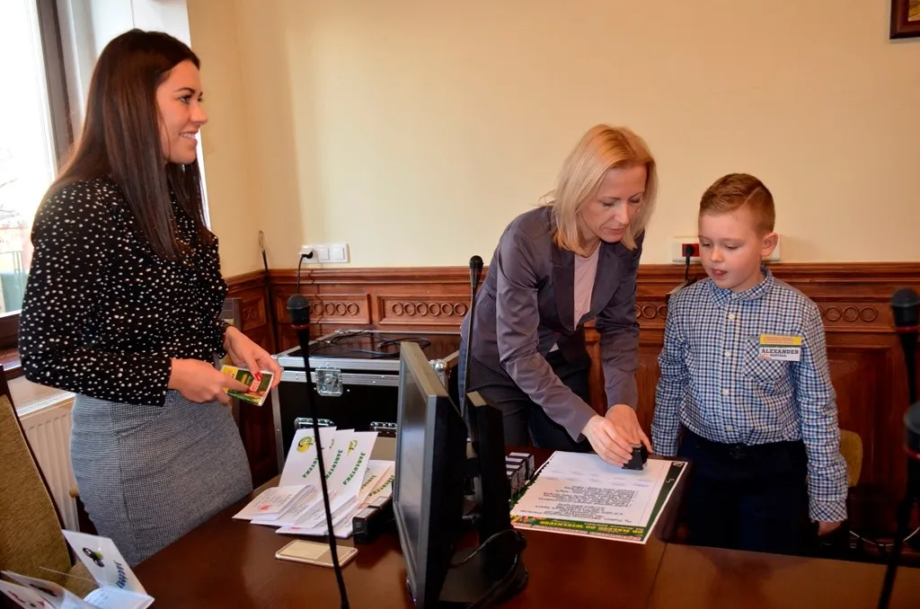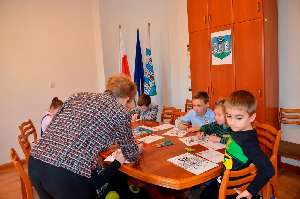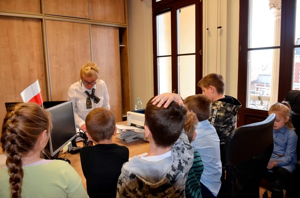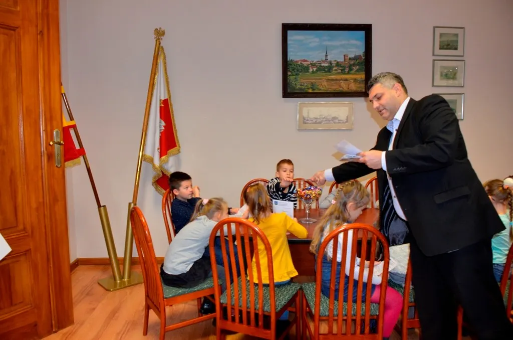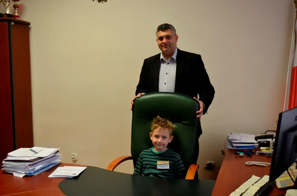 Kolejnym punktem była wizyta w gabinecie Burmistrza. Marcin Orzeszek opowiedział o swojej pracy i funkcjonowaniu urzędu. Każdy mógł zasiąść na fotelu burmistrza i zrobić sobie zdjęcie. W biurze Urzędu Stanu Cywilnego dzieci miały okazję wyszukać siebie w „tajemniczych księgach” i zobaczyć swój oryginalny akt urodzenia. Na koniec wizyty w gabinecie burmistrza dzieci dostały pismo potwierdzające nadanie tytułu „Małego Urzędnika Miasta Krzywej Wieży i dr. Frankensteina” z pieczątką i podpisem Burmistrza. Zajęcia ZUD zakończyły się w sali Konferencyjnej, gdzie dzieci otrzymały imienne pieczątki, którymi podbiły wspólną „deklarację obywatelską”.