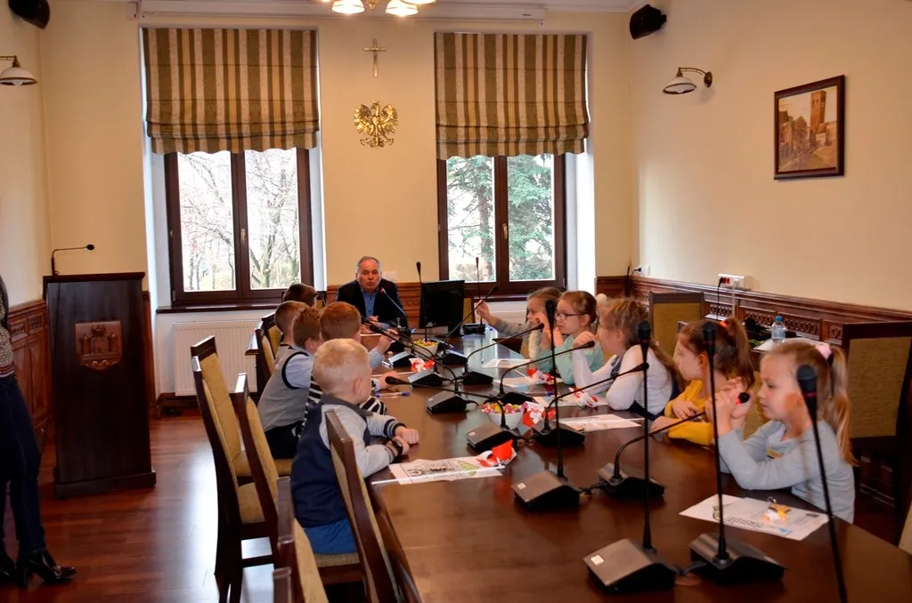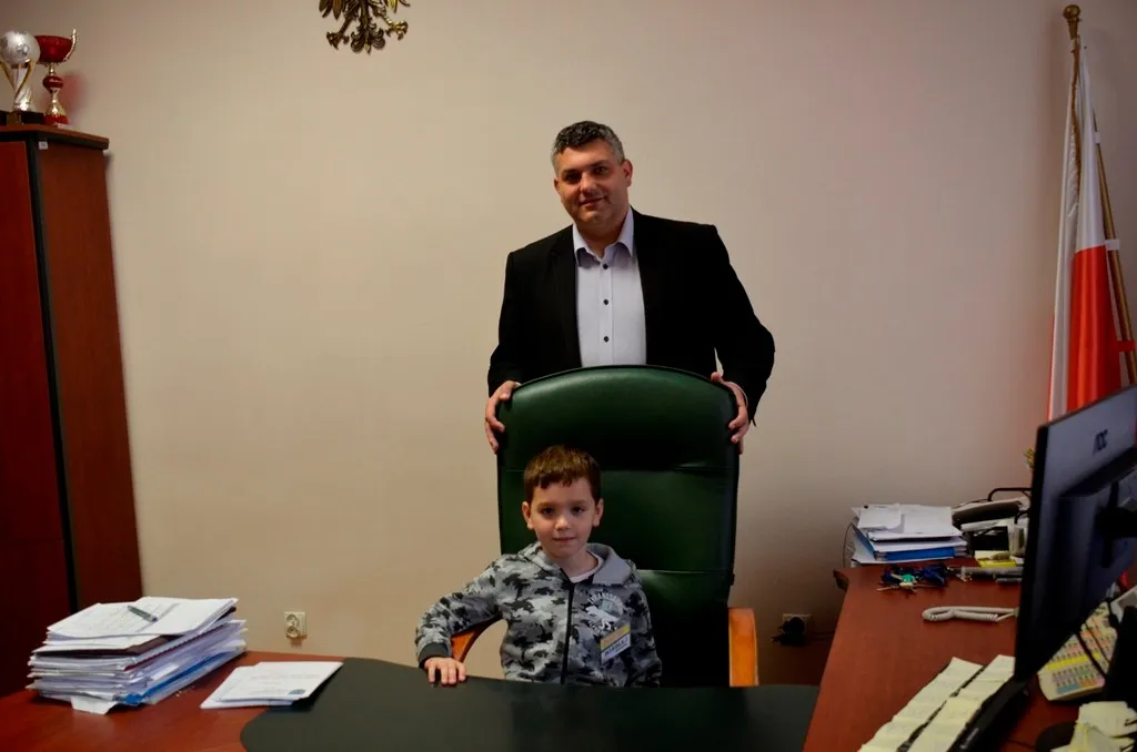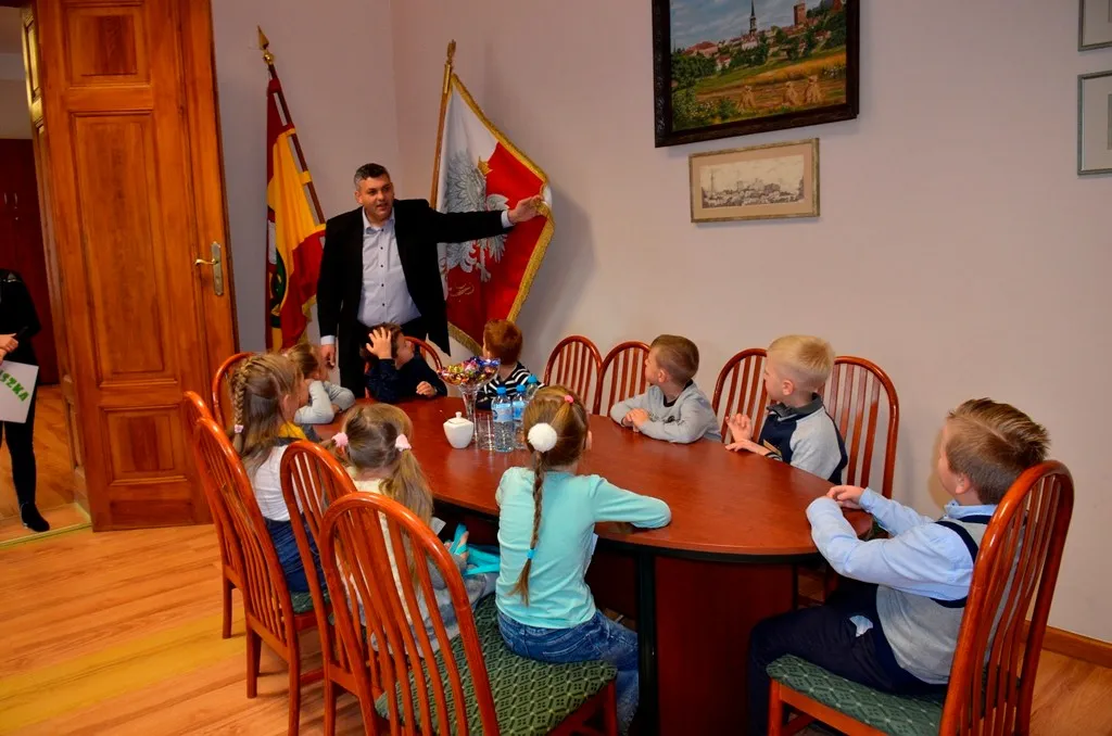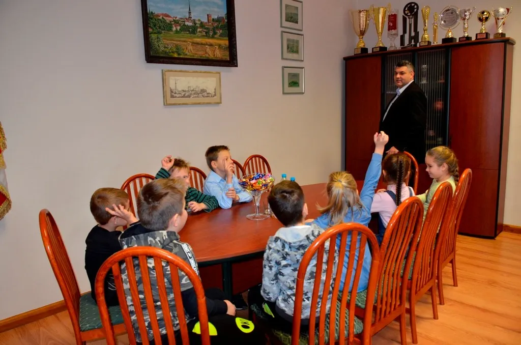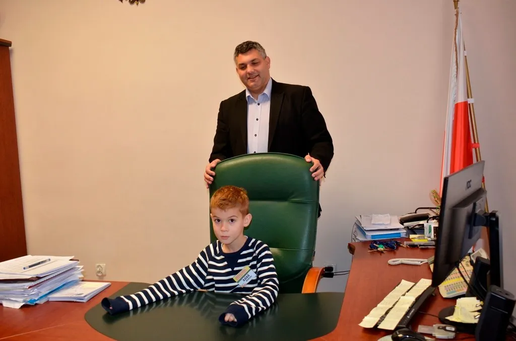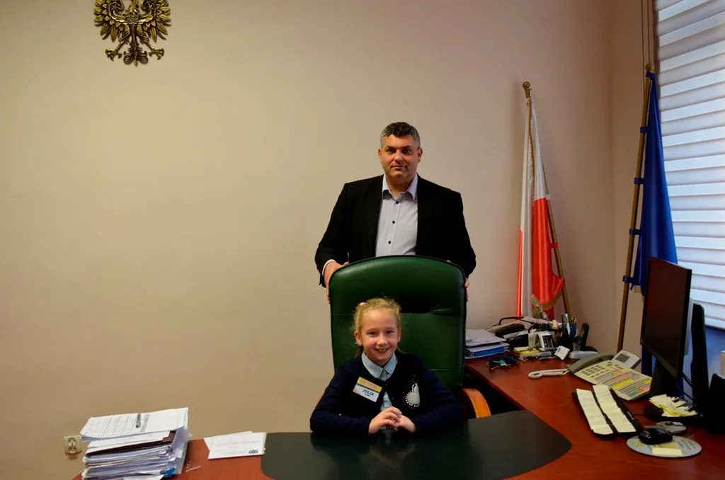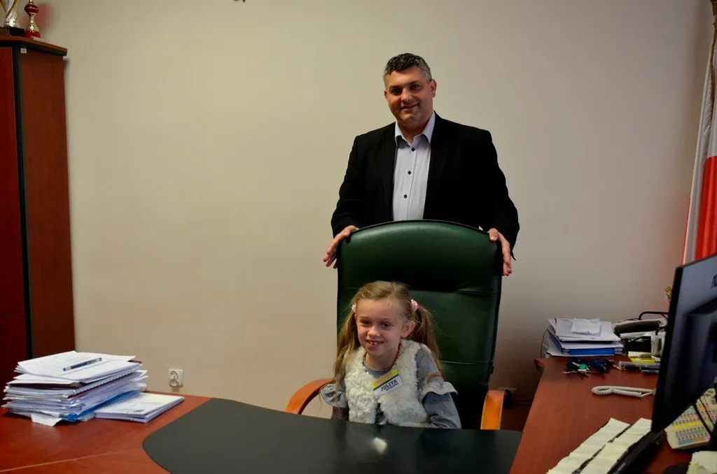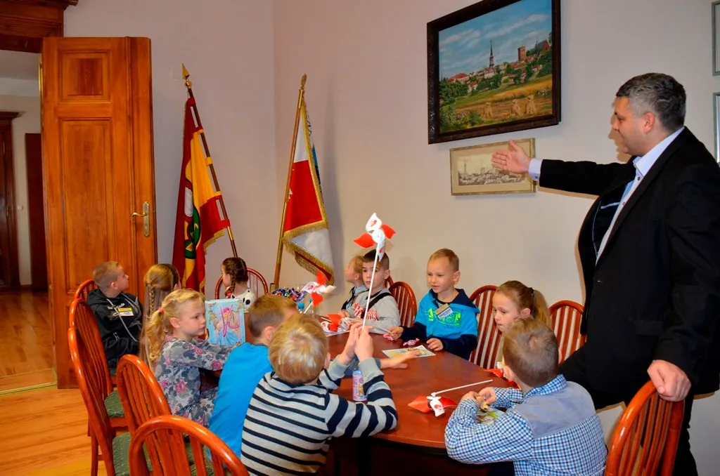 Kolejnym punktem była wizyta w gabinecie Burmistrza. Marcin Orzeszek opowiedział o swojej pracy i funkcjonowaniu urzędu. Każdy mógł zasiąść na fotelu burmistrza i zrobić sobie zdjęcie. W biurze Urzędu Stanu Cywilnego dzieci miały okazję wyszukać siebie w „tajemniczych księgach” i zobaczyć swój oryginalny akt urodzenia. Na koniec wizyty w gabinecie burmistrza dzieci dostały pismo potwierdzające nadanie tytułu „Małego Urzędnika Miasta Krzywej Wieży i dr. Frankensteina” z pieczątką i podpisem Burmistrza. Zajęcia ZUD zakończyły się w sali Konferencyjnej, gdzie dzieci otrzymały imienne pieczątki, którymi podbiły wspólną „deklarację obywatelską”.