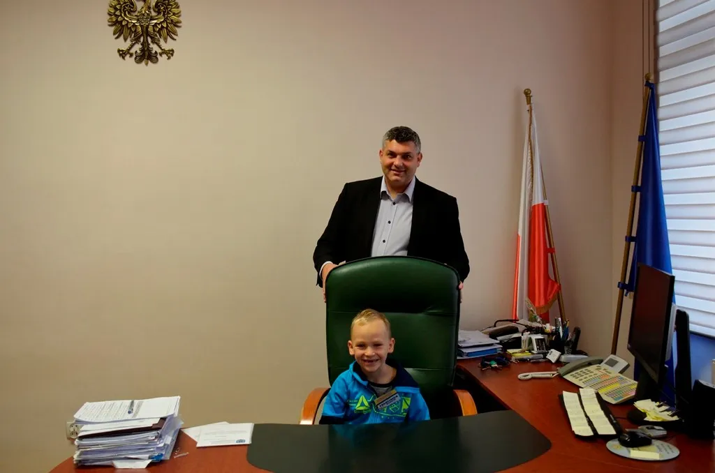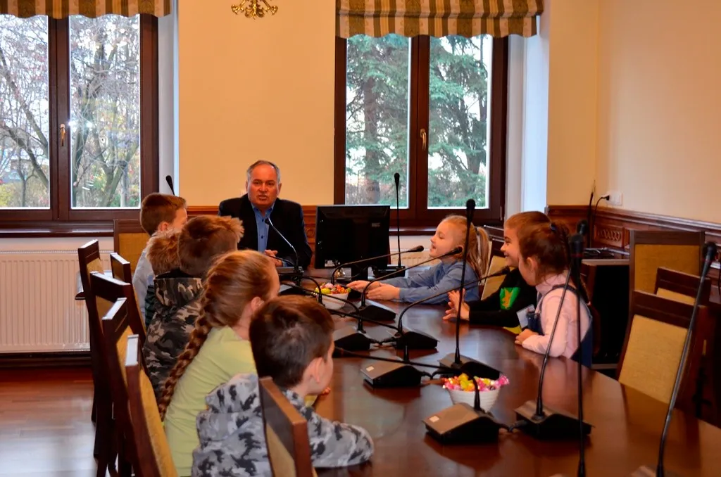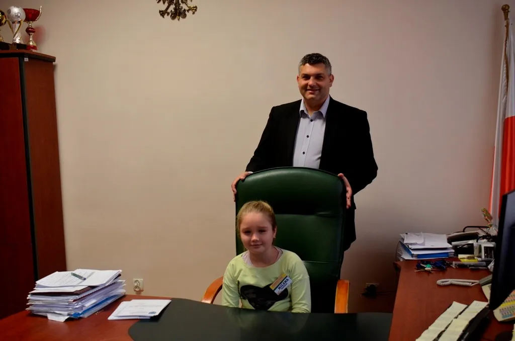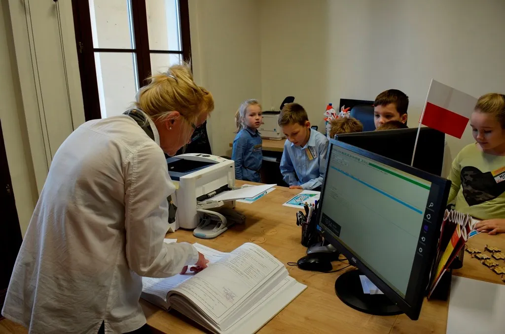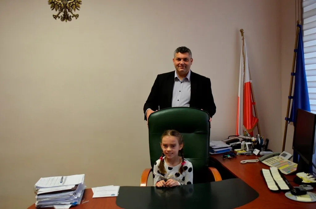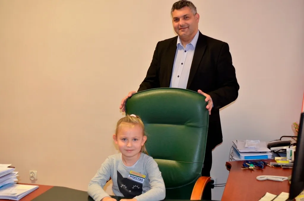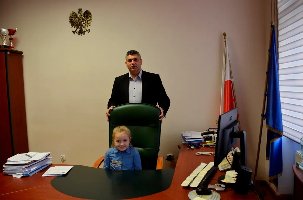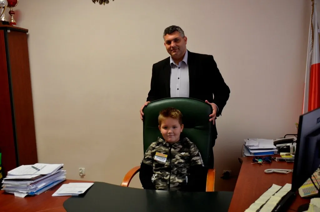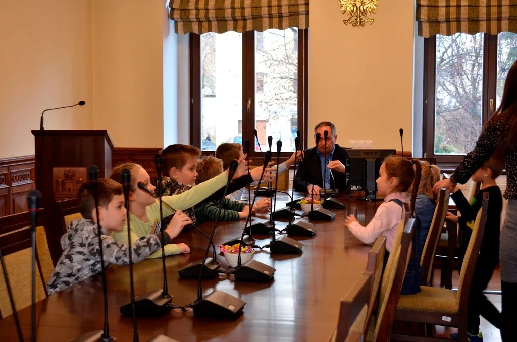 Kolejnym punktem była wizyta w gabinecie Burmistrza. Marcin Orzeszek opowiedział o swojej pracy i funkcjonowaniu urzędu. Każdy mógł zasiąść na fotelu burmistrza i zrobić sobie zdjęcie. W biurze Urzędu Stanu Cywilnego dzieci miały okazję wyszukać siebie w „tajemniczych księgach” i zobaczyć swój oryginalny akt urodzenia. Na koniec wizyty w gabinecie burmistrza dzieci dostały pismo potwierdzające nadanie tytułu „Małego Urzędnika Miasta Krzywej Wieży i dr. Frankensteina” z pieczątką i podpisem Burmistrza. Zajęcia ZUD zakończyły się w sali Konferencyjnej, gdzie dzieci otrzymały imienne pieczątki, którymi podbiły wspólną „deklarację obywatelską”.
