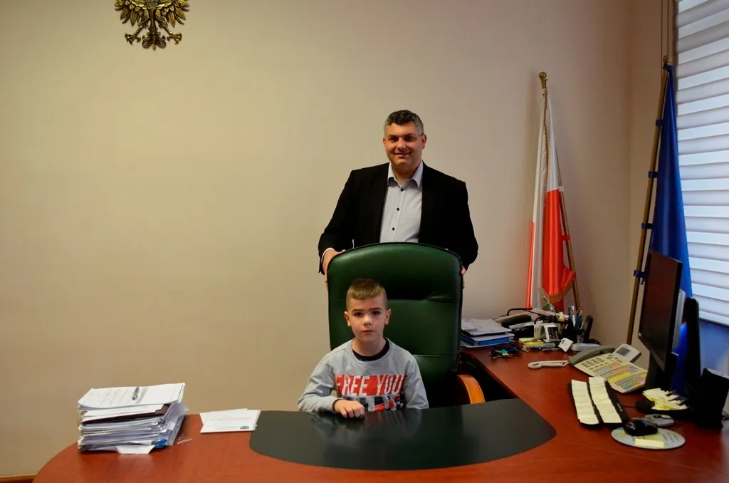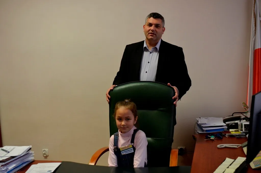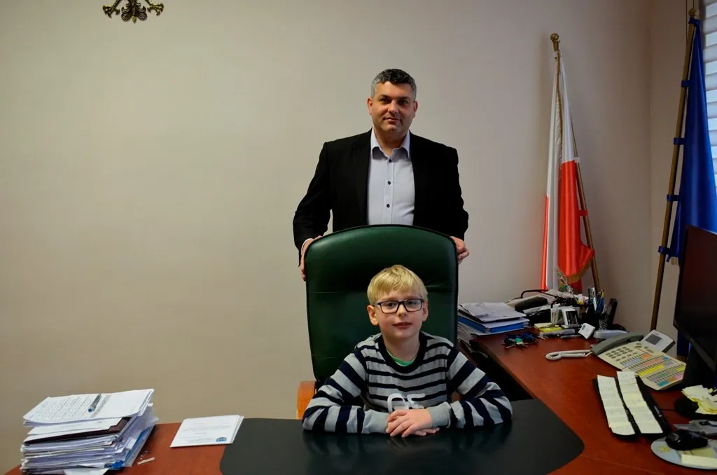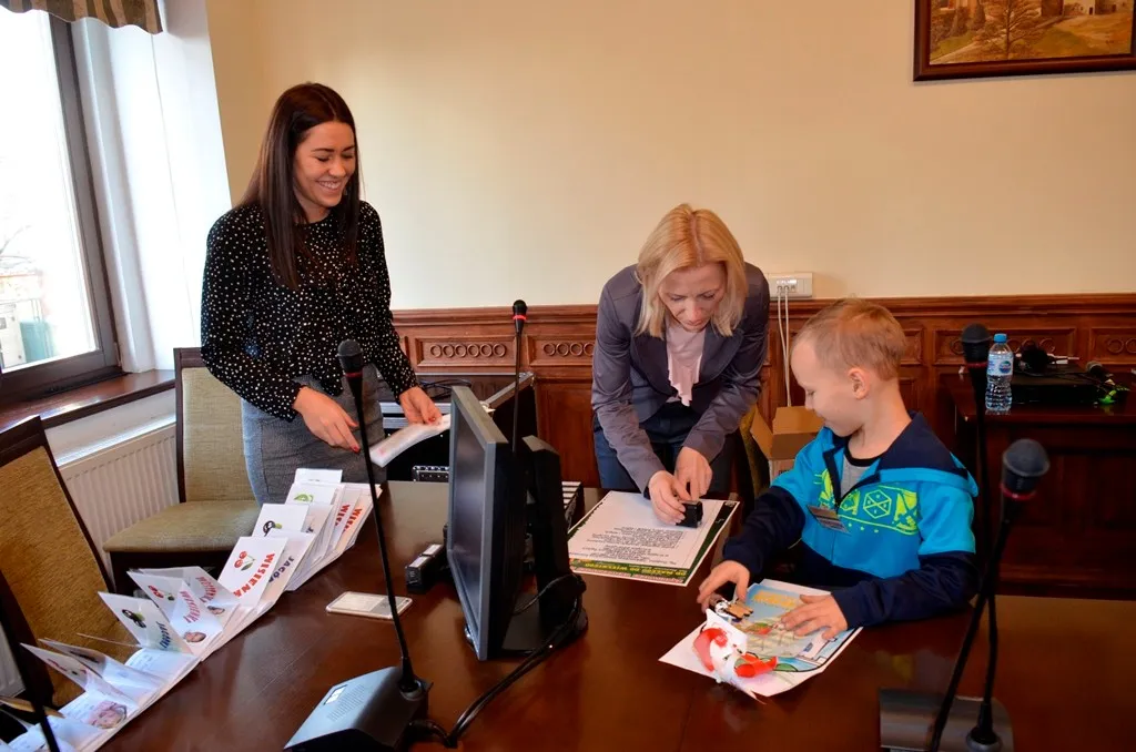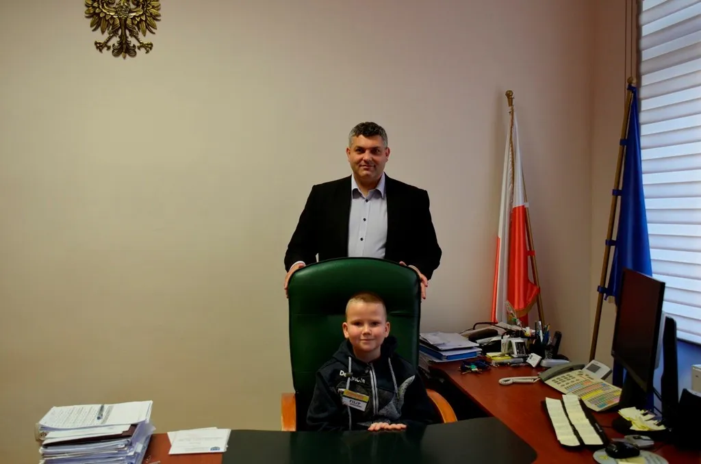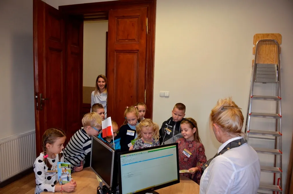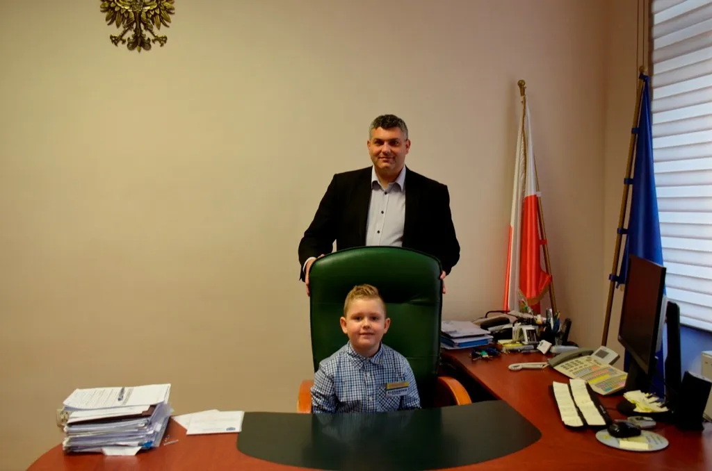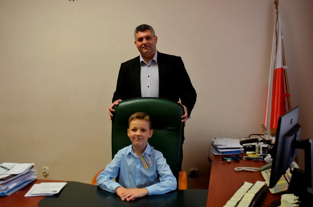 Kolejnym punktem była wizyta w gabinecie Burmistrza. Marcin Orzeszek opowiedział o swojej pracy i funkcjonowaniu urzędu. Każdy mógł zasiąść na fotelu burmistrza i zrobić sobie zdjęcie. W biurze Urzędu Stanu Cywilnego dzieci miały okazję wyszukać siebie w „tajemniczych księgach” i zobaczyć swój oryginalny akt urodzenia. Na koniec wizyty w gabinecie burmistrza dzieci dostały pismo potwierdzające nadanie tytułu „Małego Urzędnika Miasta Krzywej Wieży i dr. Frankensteina” z pieczątką i podpisem Burmistrza. Zajęcia ZUD zakończyły się w sali Konferencyjnej, gdzie dzieci otrzymały imienne pieczątki, którymi podbiły wspólną „deklarację obywatelską”.