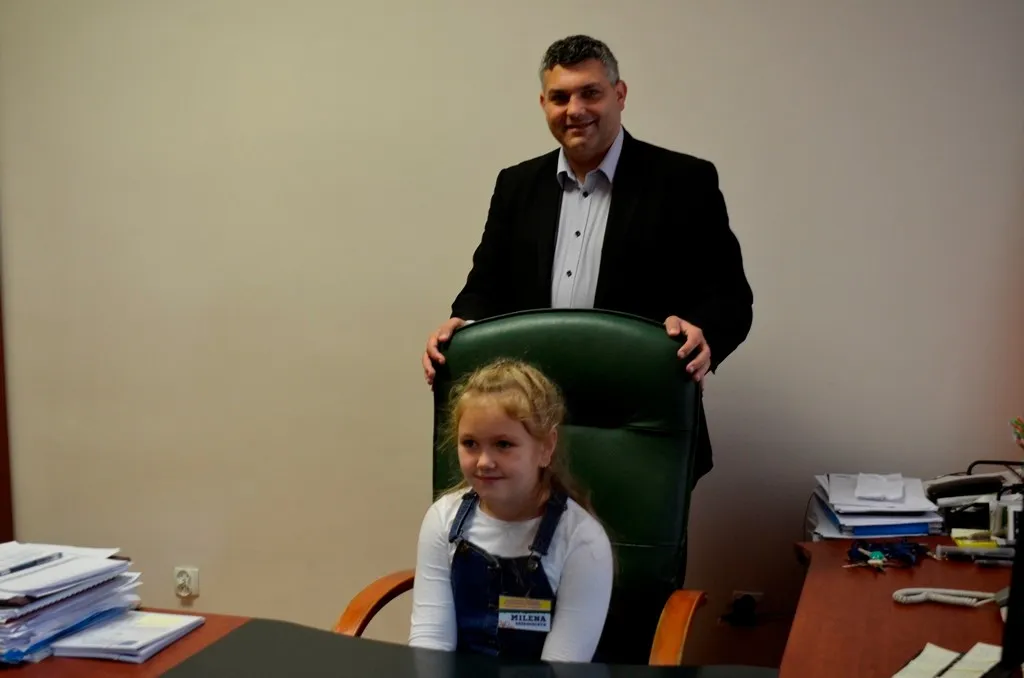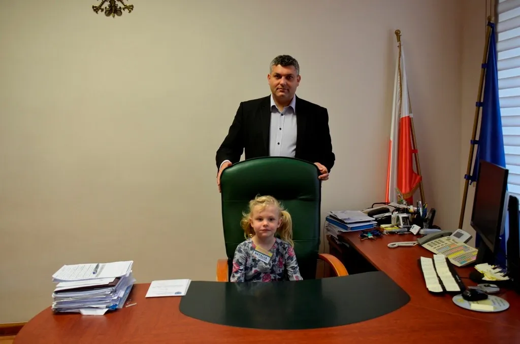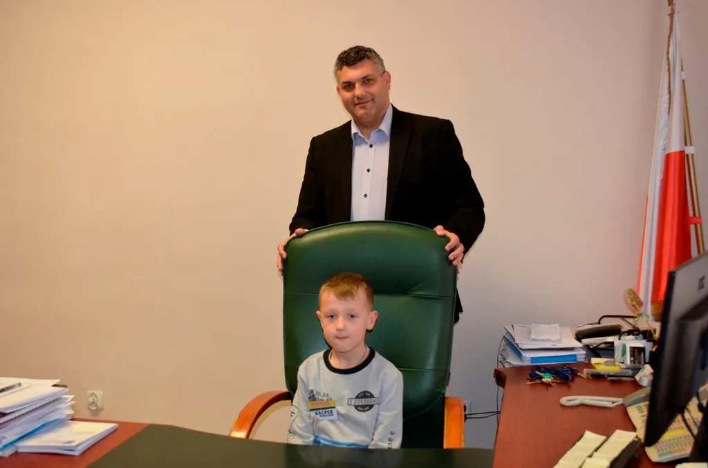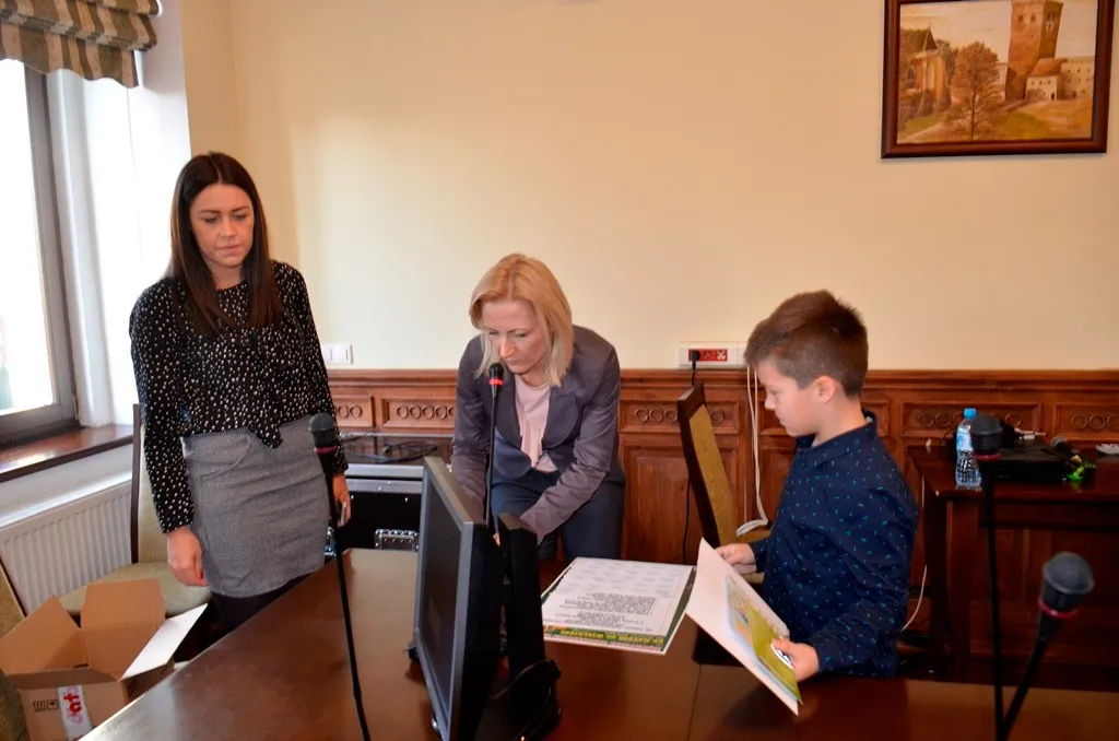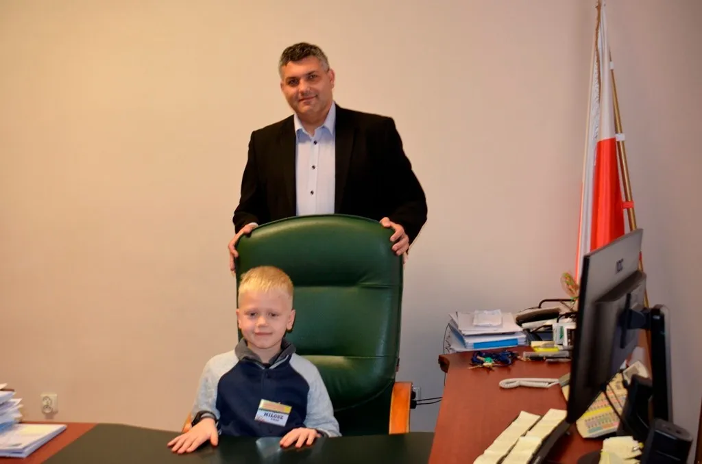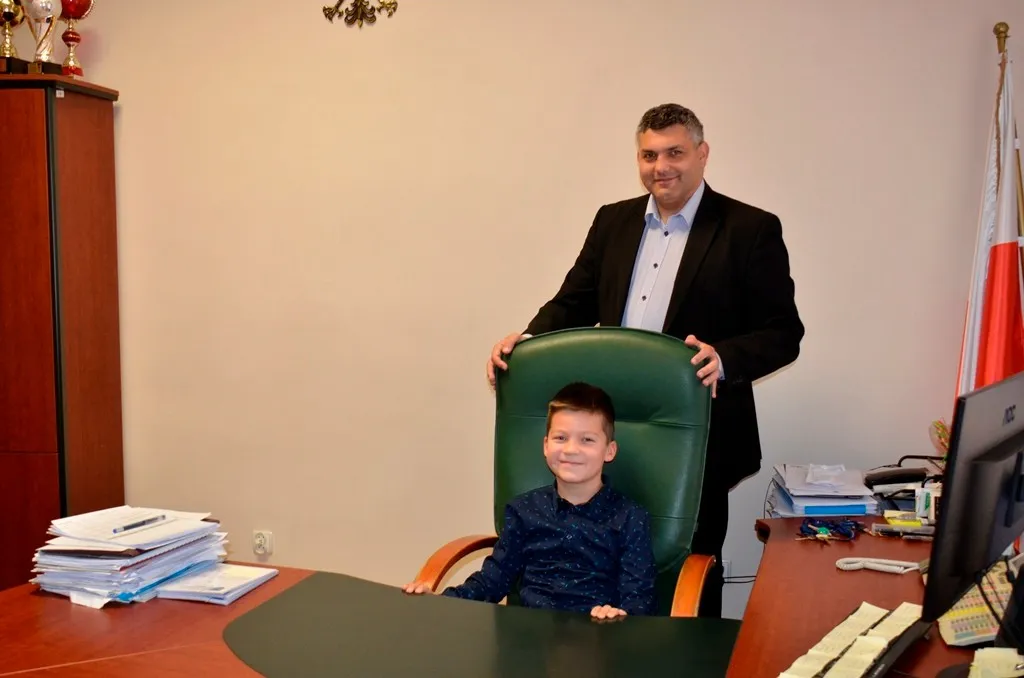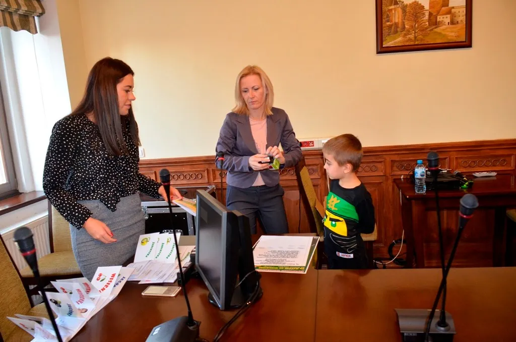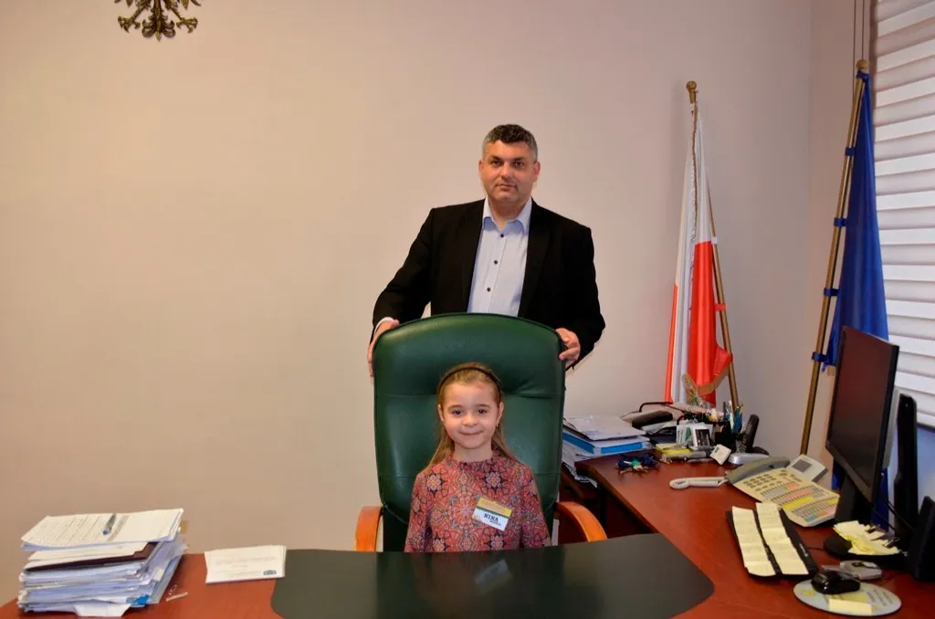 Kolejnym punktem była wizyta w gabinecie Burmistrza. Marcin Orzeszek opowiedział o swojej pracy i funkcjonowaniu urzędu. Każdy mógł zasiąść na fotelu burmistrza i zrobić sobie zdjęcie. W biurze Urzędu Stanu Cywilnego dzieci miały okazję wyszukać siebie w „tajemniczych księgach” i zobaczyć swój oryginalny akt urodzenia. Na koniec wizyty w gabinecie burmistrza dzieci dostały pismo potwierdzające nadanie tytułu „Małego Urzędnika Miasta Krzywej Wieży i dr. Frankensteina” z pieczątką i podpisem Burmistrza. Zajęcia ZUD zakończyły się w sali Konferencyjnej, gdzie dzieci otrzymały imienne pieczątki, którymi podbiły wspólną „deklarację obywatelską”.