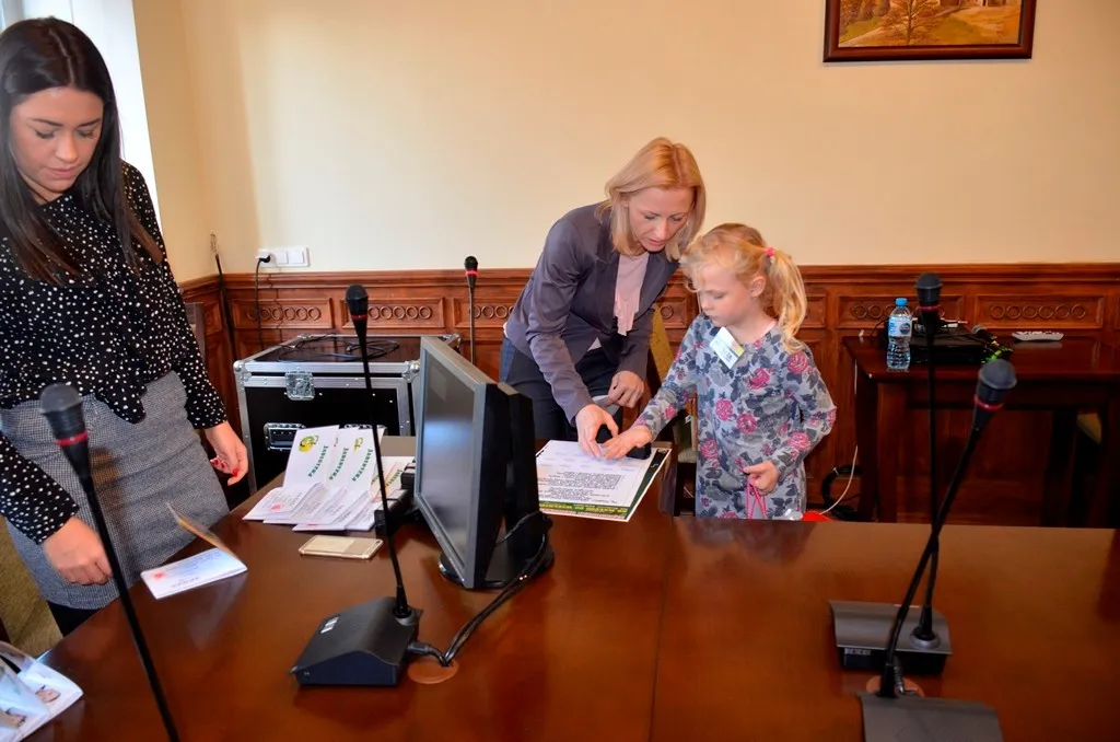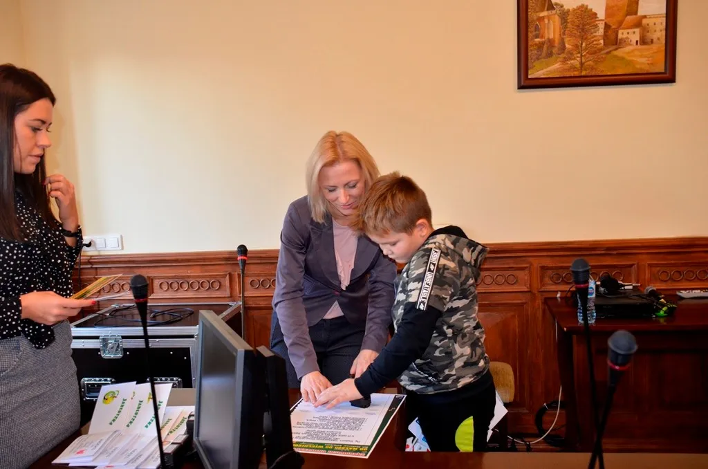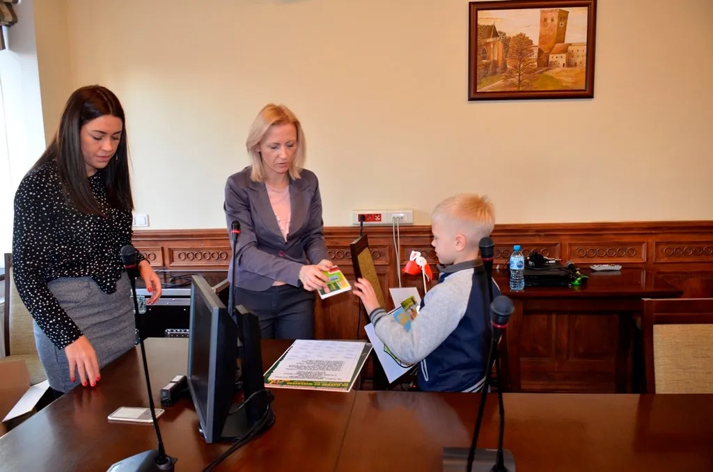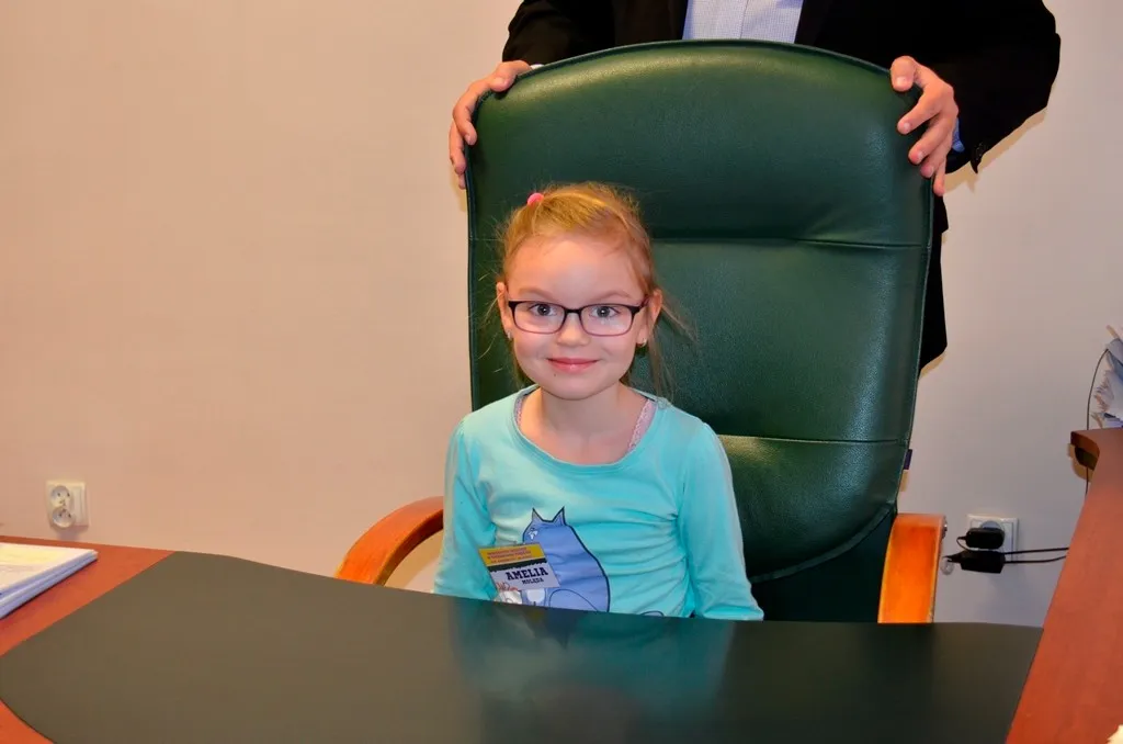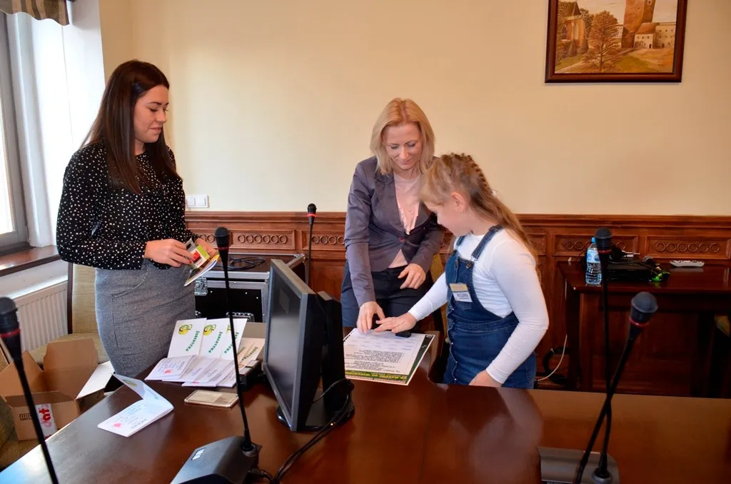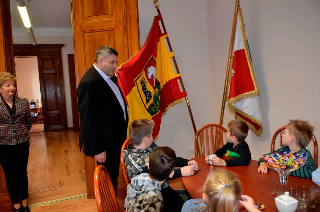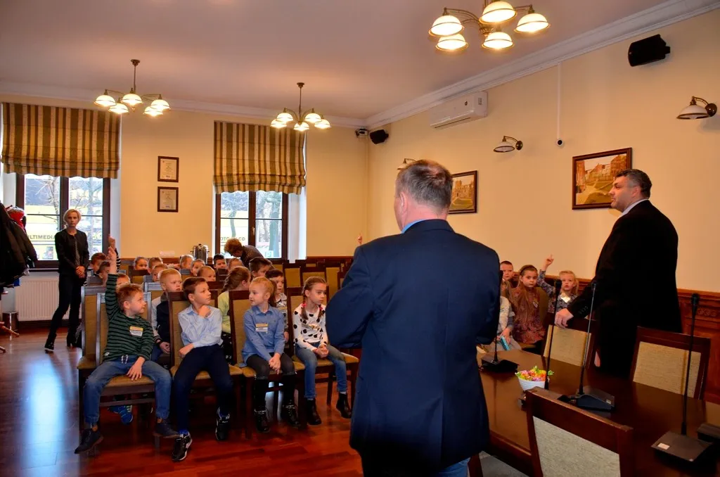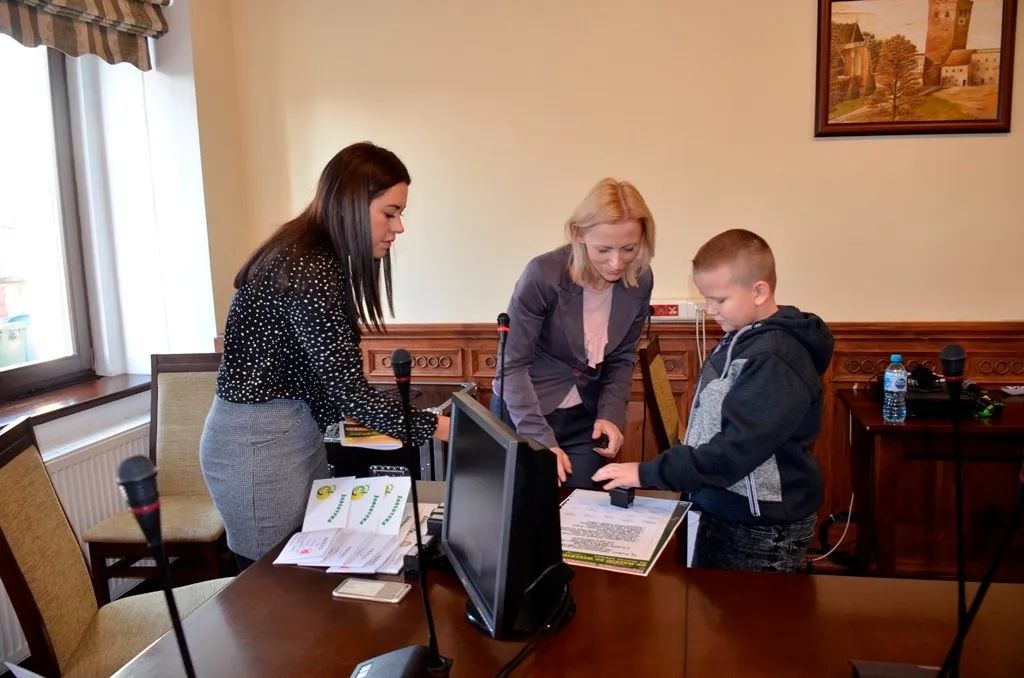 Kolejnym punktem była wizyta w gabinecie Burmistrza. Marcin Orzeszek opowiedział o swojej pracy i funkcjonowaniu urzędu. Każdy mógł zasiąść na fotelu burmistrza i zrobić sobie zdjęcie. W biurze Urzędu Stanu Cywilnego dzieci miały okazję wyszukać siebie w „tajemniczych księgach” i zobaczyć swój oryginalny akt urodzenia. Na koniec wizyty w gabinecie burmistrza dzieci dostały pismo potwierdzające nadanie tytułu „Małego Urzędnika Miasta Krzywej Wieży i dr. Frankensteina” z pieczątką i podpisem Burmistrza. Zajęcia ZUD zakończyły się w sali Konferencyjnej, gdzie dzieci otrzymały imienne pieczątki, którymi podbiły wspólną „deklarację obywatelską”.