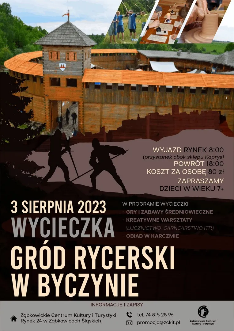 3 sierpnia 2023 r., WYCIECZKA DO GRODU RYCERSKIEGO W BYCZYNIE: koszt za osobę 80 zł;