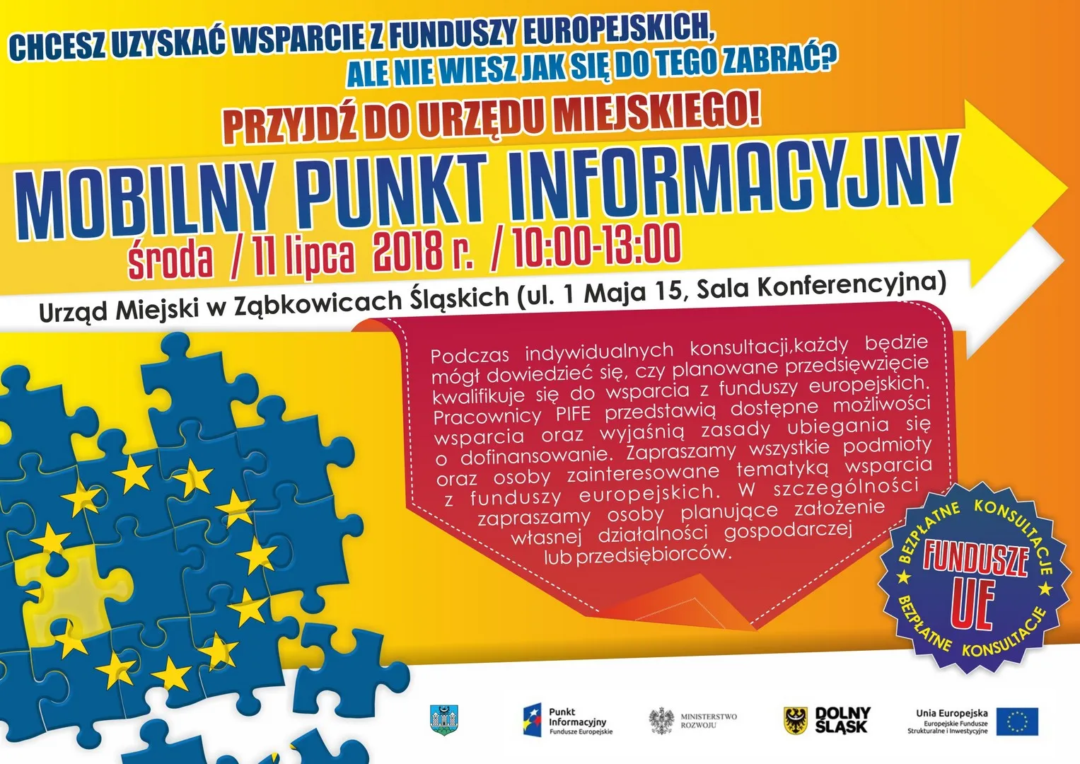 Mobilny Punkt Informacyjny będzie funkcjonował w dniu 11 lipca 2018 r. w siedzibie Urzędu Miejskiego w Ząbkowicach Śląskich, ul. 1 Maja 15, Sala Konferencyjna w godzinach 10.00 - 13.00.