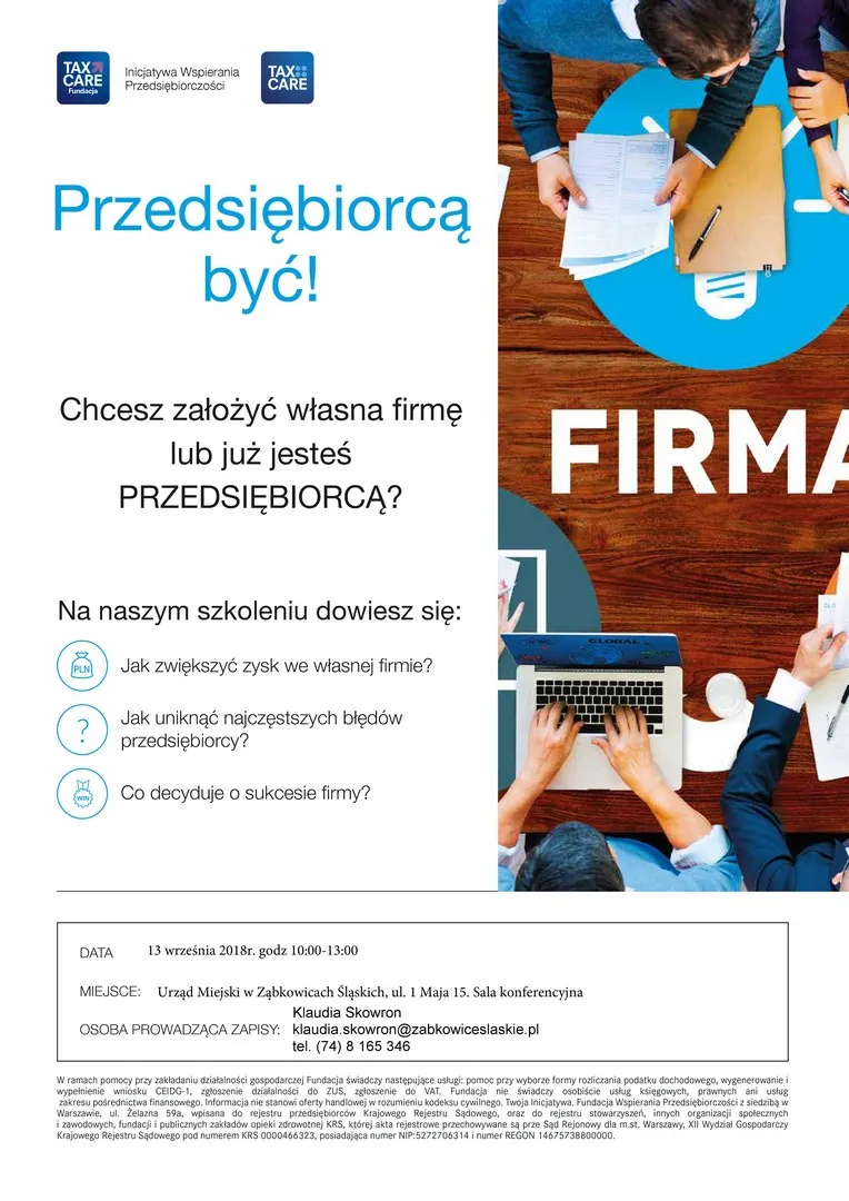 Osoby zainteresowane udziałem w szkoleniu proszone są o kontakt z p. Klaudią Skowron w celu rejestracji: