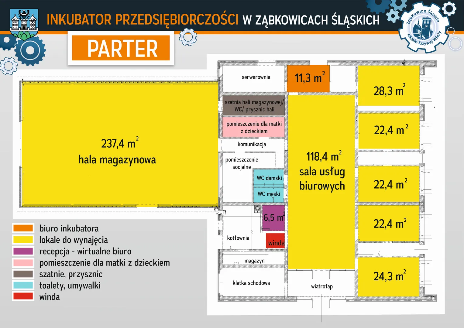Inkubator przygotowany jest pod działalność minimum dziewięciu firm. Wśród pomieszczeń znajduje się część biurowa, wyposażona w meble oraz sprzęt komputerowy z możliwością skorzystania z infrastruktury informatycznej i Internetu. Do dyspozycji jest 7 pomieszczeń biurowych klimatyzowanych o powierzchni od 13,7 m2 do 28, 3 m2 do długoterminowego wynajęcia oraz biuro o powierzchni 13,8 m2, które będzie można wynająć na godziny lub kilka dni.