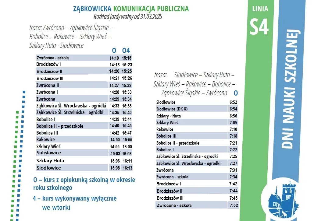 W związku z remontem drogi w Sulisławicach od 07.01.2026 r. obowiązywać będzie nowy rozkład jazdy tymczasowej zastępczej komunikacji autobusowej do szkoły w Zwróconej linii nr S4.